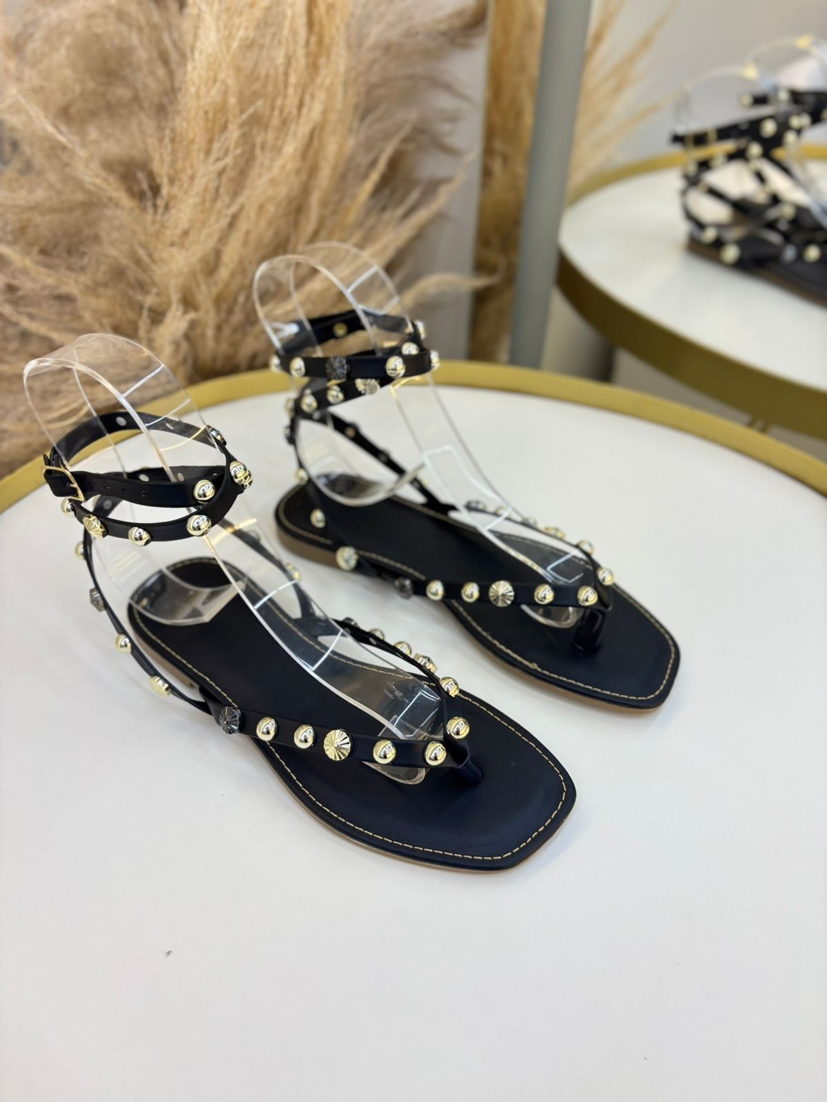 Sandália rasteira feminina com design moderno e sofisticado, perfeita para quem busca conforto sem abrir mão da elegância. Confeccionada em material sintético de alta qualidade, possui tiras finas com aplicação de tachas metálicas douradas, que garantem um toque fashion e luxuoso ao modelo.